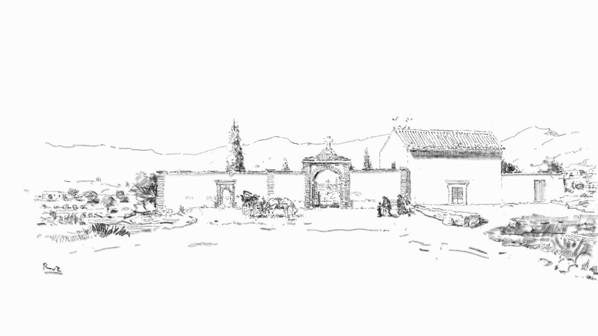 Artículo de José Luis Ruz Márquez publicado en el periódico Diario de Almería de 1 de noviembre de 202. Dibujo del autor."Cuando en 1814 se retiran los franceses dejan un país en ruinas pero también, no sé si en desagravio de tanto como robaron, muchos gérmenes de modernidad, entre los que se halla el cementerio tal como lo conocemos hoy, en el extrarradio y con el viento adecuado, para sustituir los enterramientos en el templo o a su alrededor, como aún pudimos ver en Alcolea y La Alquería.